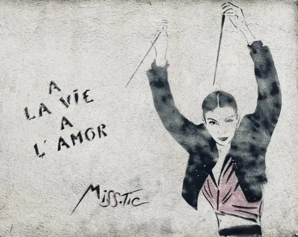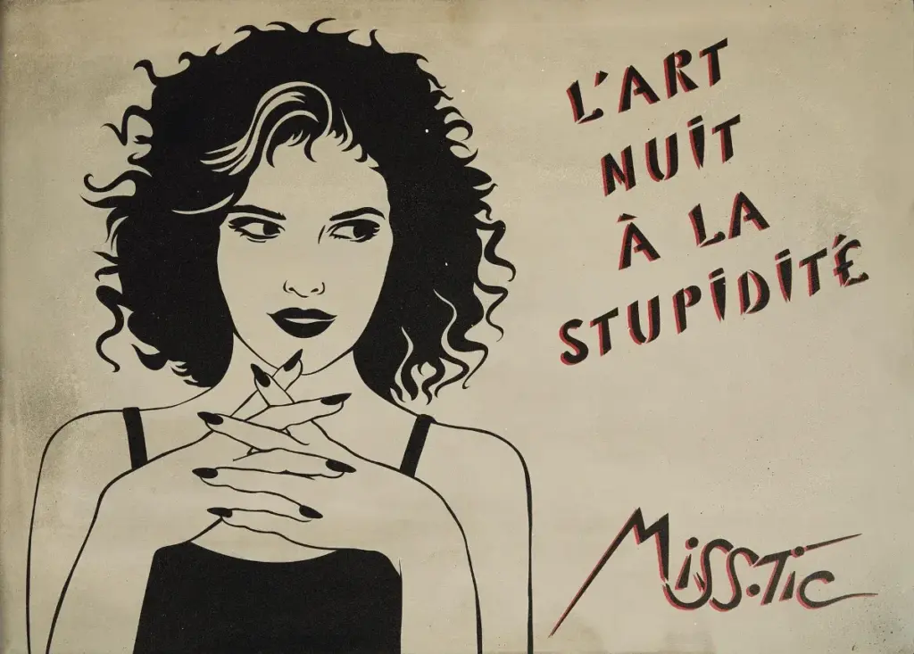 C’est dans ce contexte que Miss.Tic, influencée par cette effervescence américaine mais aussi par les premiers pochoiristes parisiens, décide d’abandonner le théâtre pour investir l’espace public. En 1985, elle réalise sa première œuvre murale, important non seulement une technique, mais aussi l’idée que la rue pouvait être une scène. Cette démarche préfigure un changement de paradigme radical : aujourd’hui, le street art est non seulement institutionnalisé, mais il alimente également un second marché très spéculatif où les œuvres d’artistes comme Banksy ou Kaws atteignent des records dans les plus grandes maisons de vente. Le parcours de Miss.Tic elle-même, de la condamnation à l’entrée dans les collections, incarne cette trajectoire.